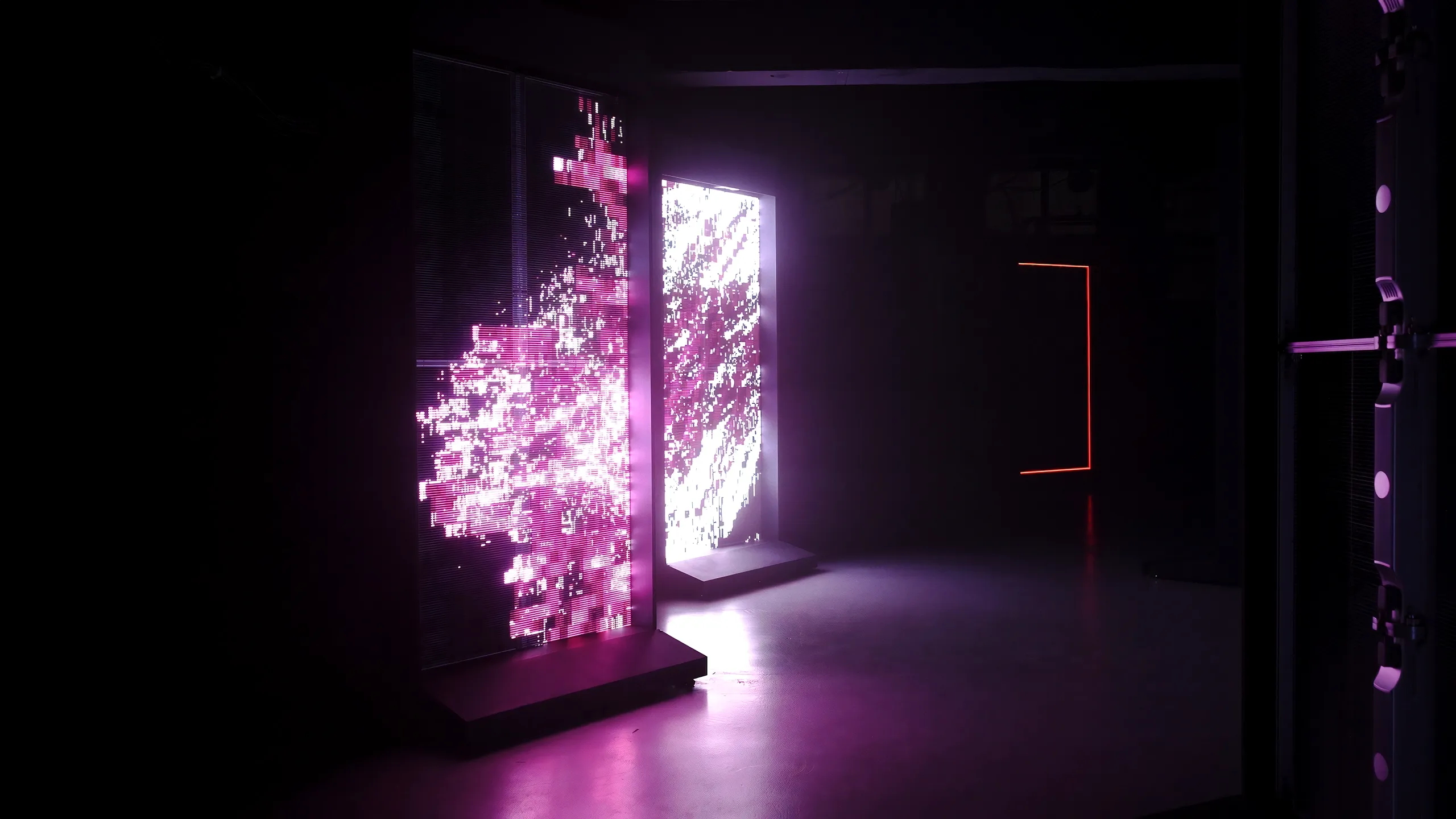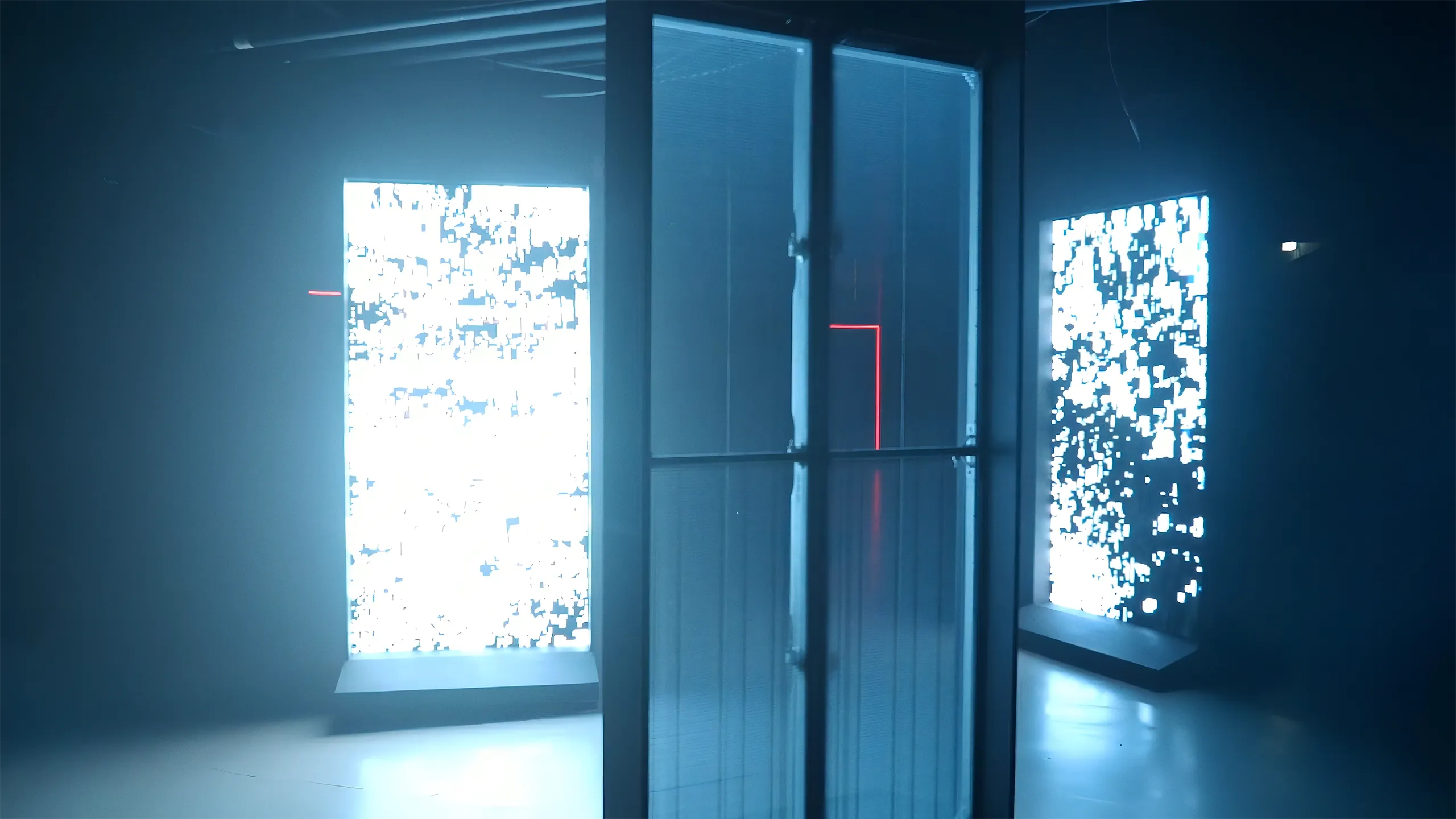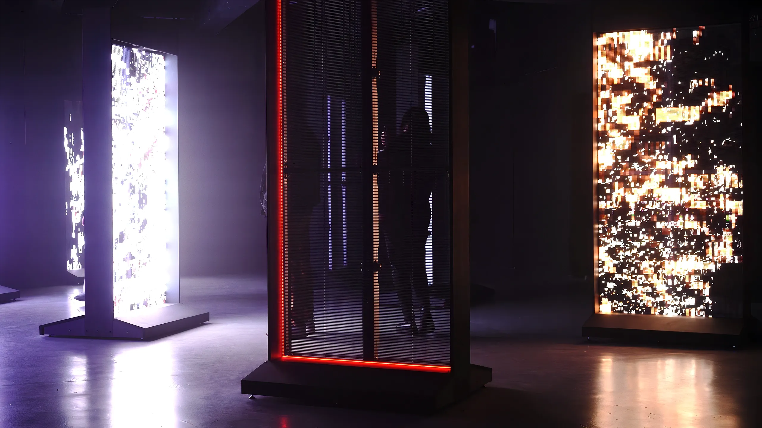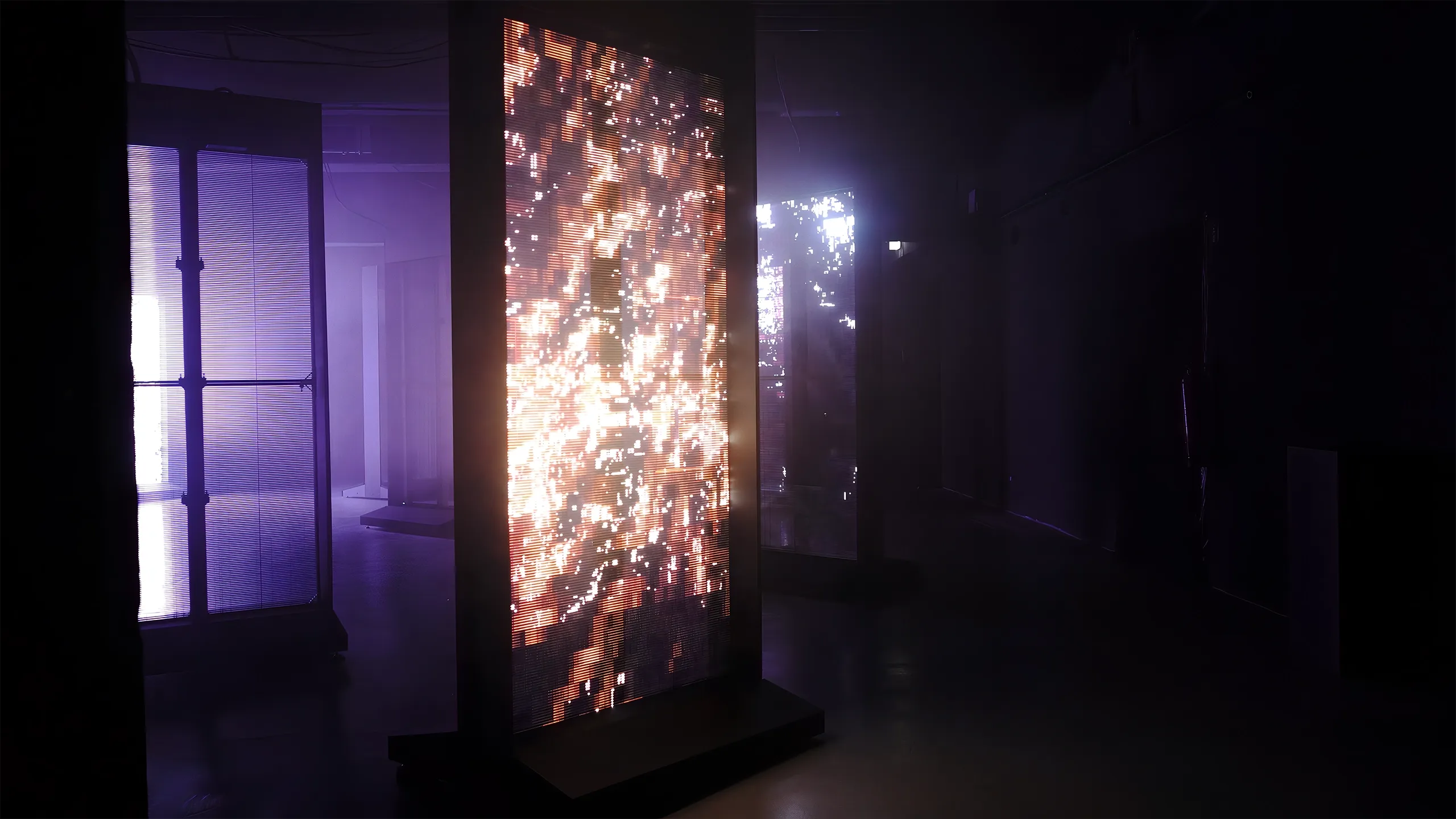 Each transparent portal reveals a unique intersection of the virtual landscape, connected to its neighbors through spatial awareness technology. As individuals approach and gaze into these entryways, the portals respond—tracking both their relationship to other portals and the presence of visitors. This interplay between artistic expression and human interaction generates ever-shifting displays of movement and color, accompanied by a spatial audio score that allows each virtual entity to be followed throughout the space.